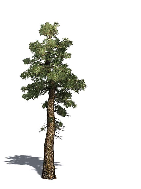 Douglas Fir is native to western North America. Its growth range extends from northern Mexico up the coasts of California and British Columbia to Alaska, and from coastal regions inland to the Rocky Mountains. Douglas fir trees can easily reach a height of 300 feet, with a diameter of ten to seventeen feet. Early loggers recorded that old-growth Douglas firs reached 400 feet! Young trees have smooth bark dotted with resin-filled blisters. Older trees have rough bark that can be up to twelve inches thick. [1]