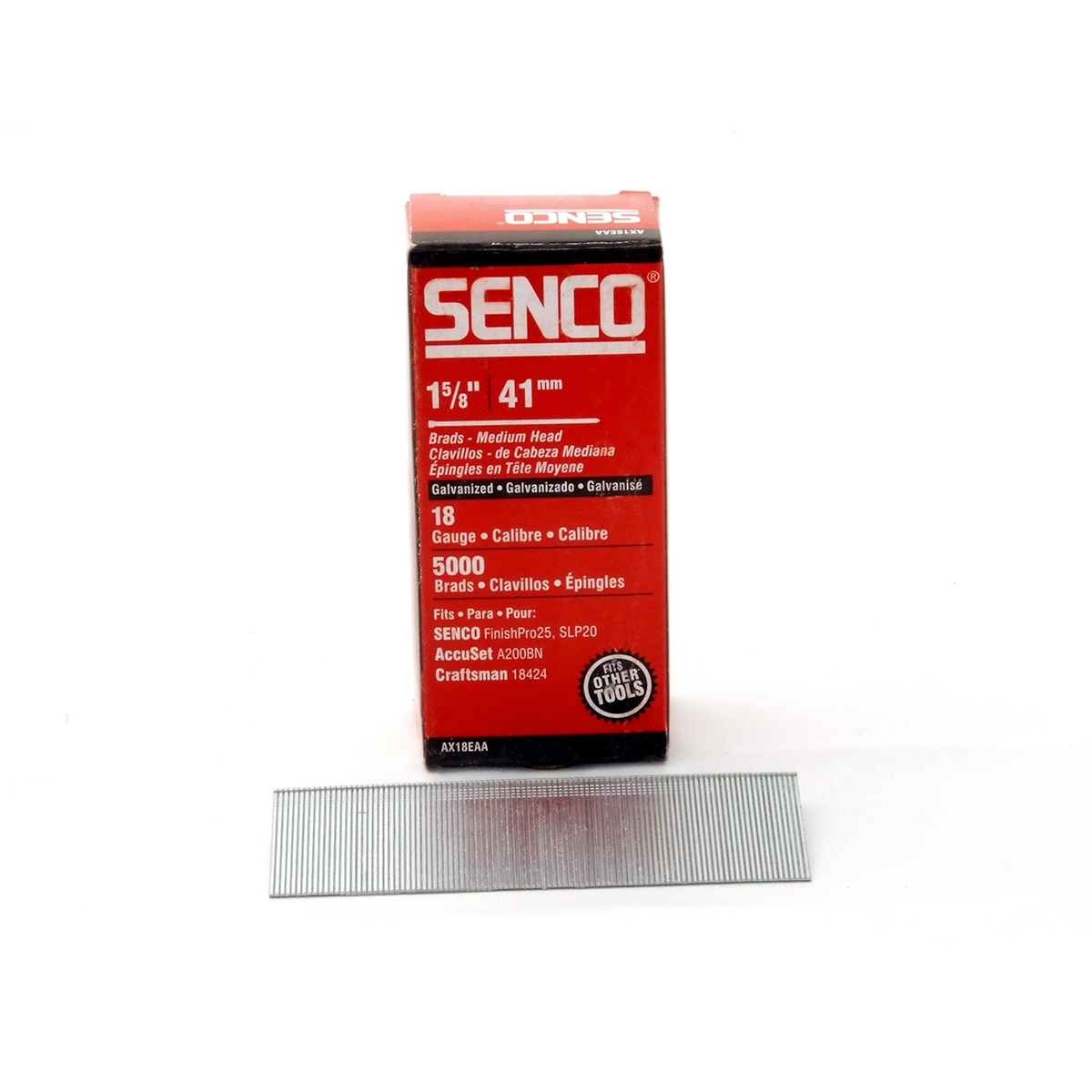 Senco 1-5/8" 18 Gauge Straight Strip Brad Nails - 5000 CountLength - 1-5/8"Head - MediumPoint - ChiselFinish - GalvanizedCoating - PlainCarton Count - 5000